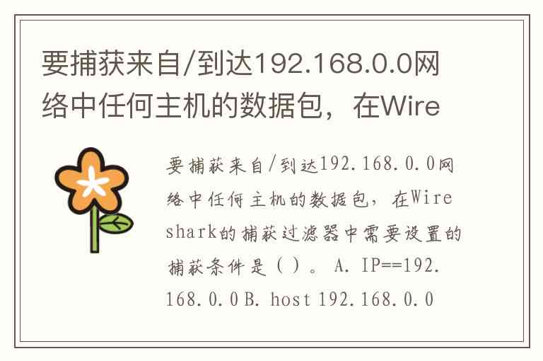 要捕获来自/到达192.168.0.0网络中任何主机的数据包,在Wireshark的捕获过滤器中需要设置的捕获条件是()。 A. IP==192.168.0.0 B. host 192.168.0.0 C. net 192.168.0.0 D. net 192.168.0.0/24