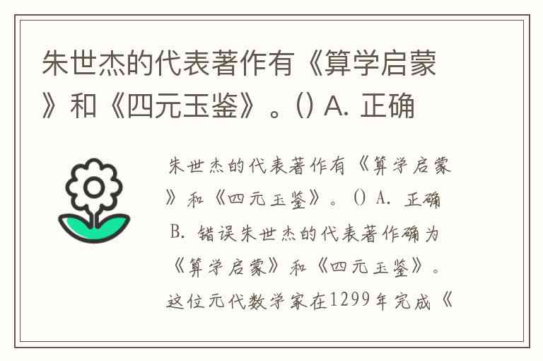 朱世杰的代表著作有《算学启蒙》和《四元玉鉴》。() A. 正确 B. 错误