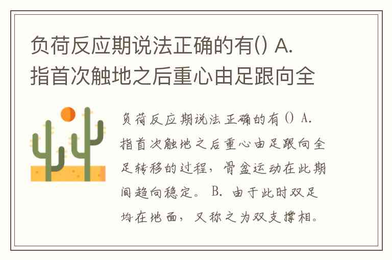 A:描述不准确。负荷反应期的核心是足跟着地到全足接触,重心转移发生在后续的支撑中期;且骨盆在此阶段处于旋前状态以缓冲冲击,而非趋向稳定。