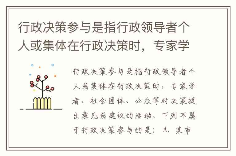 要判断哪个选项不属于行政决策参与,需紧扣定义核心:行政领导者在决策过程中,外部主体(专家、社会团体、公众等)提出意见或建议。关键点在于“决策时”(即决策制定阶段)的意见输入,而非决策完成后的评价。