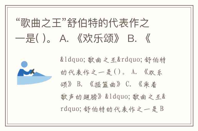“歌曲之王”舒伯特的代表作之一是( )。 A. 《欢乐颂》 B. 《摇篮曲》 C. 《乘着歌声的翅膀》