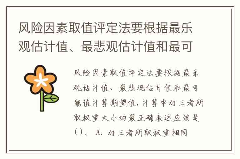 风险因素取值评定法要根据最乐观估计值、最悲观估计值和最可能值计算期望值,计算中对三者所取权重大小的最正确表述应该是( )。 A. 对三者所取权重相同 B. 对三者所取权重各不相同 C. 对最可能值取较大权重 D. 对最乐观值取较大权重