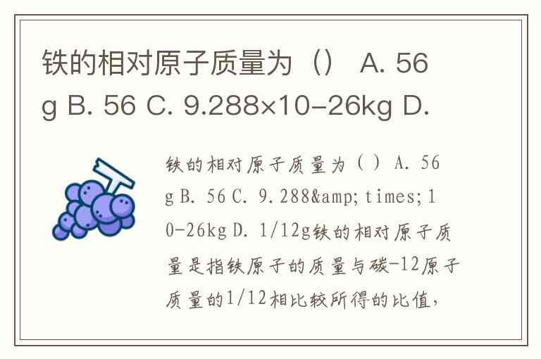 铁的相对原子质量为() A. 56g B. 56 C. 9.288×10-26kg D. 1/12g