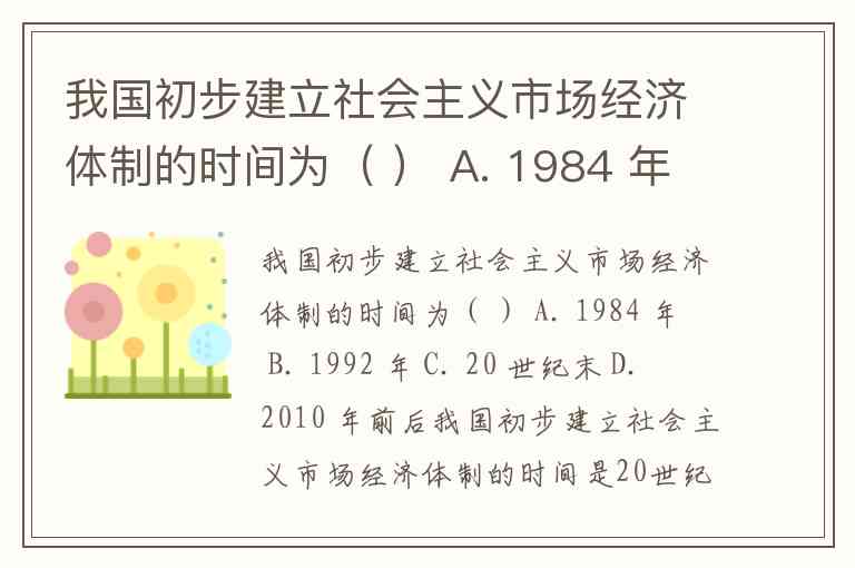 我国初步建立社会主义市场经济体制的时间为( ) A. 1984 年 B. 1992 年 C. 20 世纪末 D. 2010 年前后