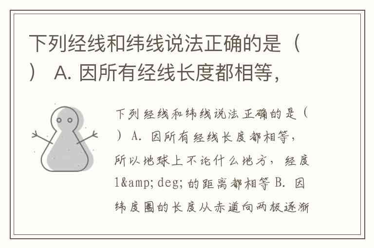 下列经线和纬线说法正确的是() A. 因所有经线长度都相等,所以地球上不论什么地方,经度1°的距离都相等 B. 因纬度圈的长度从赤道向两极逐渐减少,所以纬线1°的距离也从赤道向两极逐渐减少 C. 因地轴与经线都连接南北两极,所以他们的长度都相等 D. 纬线圈长度不等,0°纬线圈最长,90°纬线最短