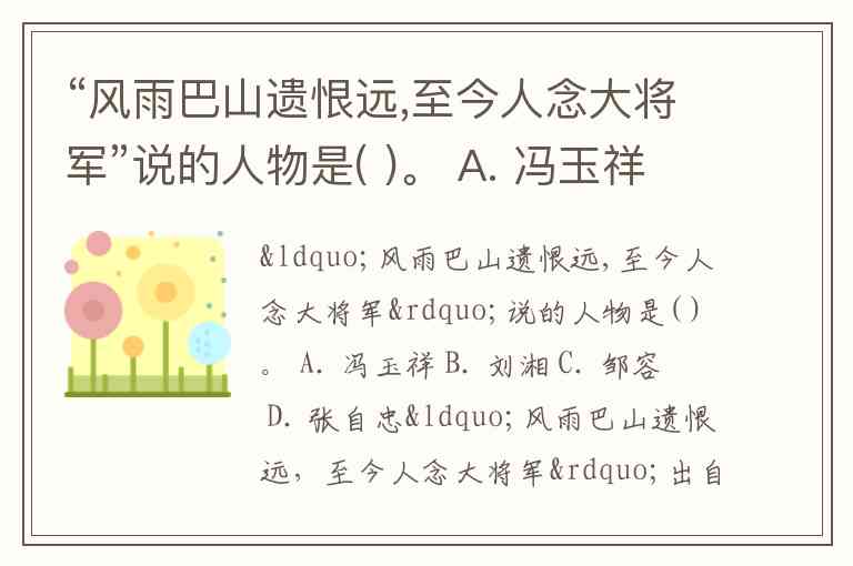 “风雨巴山遗恨远,至今人念大将军”说的人物是( )。 A. 冯玉祥 B. 刘湘 C. 邹容 D. 张自忠