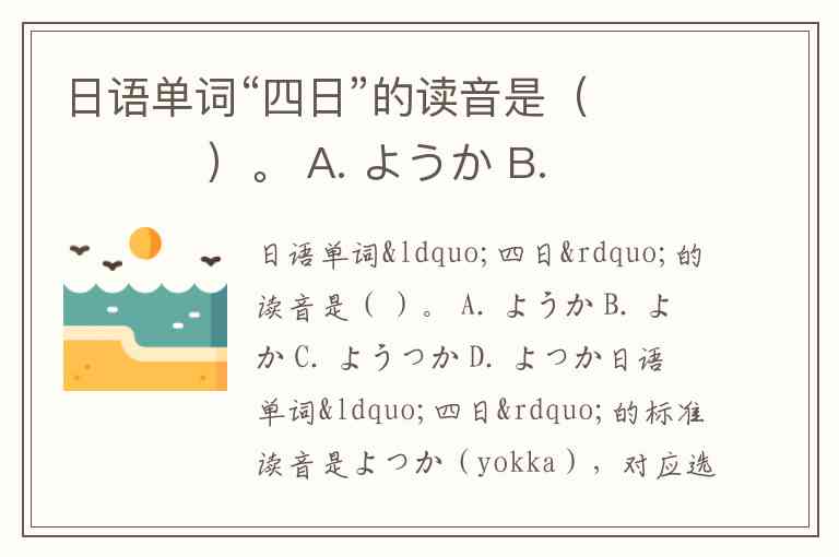 日语单词“四日”的标准读音是よっか(yokka),对应选项D。这一读音属于日语日期表达中的特殊训读规则,与数字“4”的常规音读(し/よん)不同。