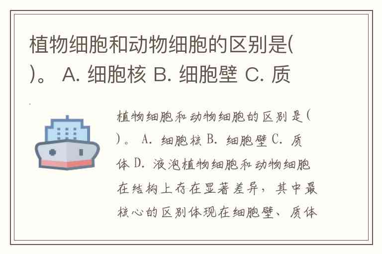植物细胞和动物细胞的区别是( )。 A. 细胞核 B. 细胞壁 C. 质体 D. 液泡