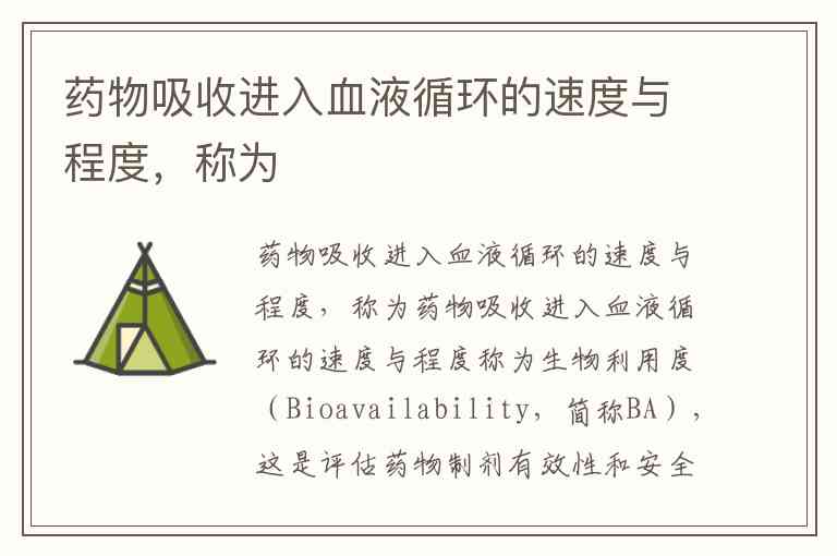 药物吸收进入血液循环的速度与程度称为生物利用度(Bioavailability,简称BA),这是评估药物制剂有效性和安全性的核心指标。它不仅反映药物被机体利用的实际情况,还直接影响药物剂量选择和治疗效果。