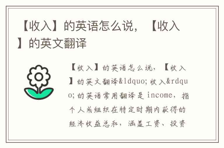 “收入”的英语常用翻译是 income,指个人或组织在特定时期内获得的经济收益总和,涵盖工资、投资回报等各类来源。另一个常见词是 revenue,更侧重企业或政府的营收,如公司销售额或税收收入。