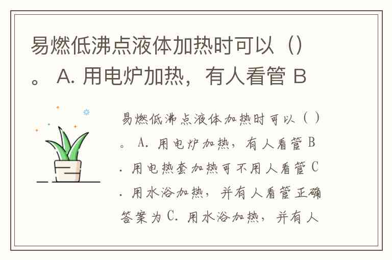 易燃低沸点液体加热时可以()。 A. 用电炉加热,有人看管 B. 用电热套加热可不用人看管 C. 用水浴加热,并有人看管