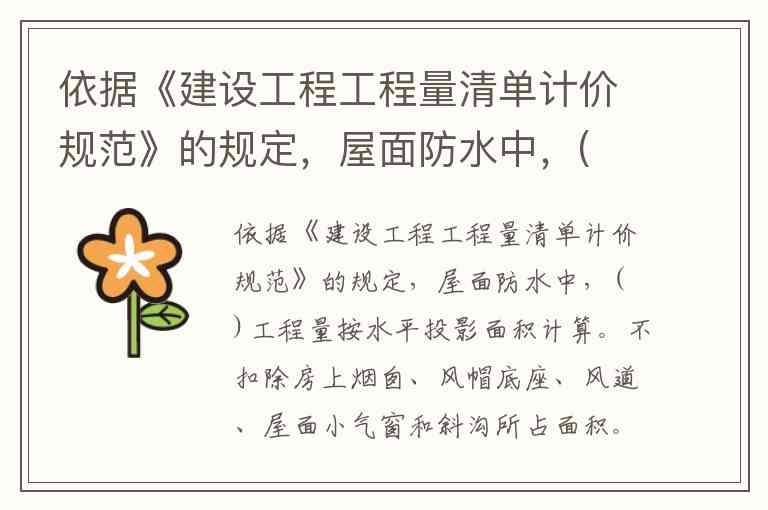 依据《建设工程工程量清单计价规范》的规定,屋面防水中,( )工程量按水平投影面积计算。不扣除房上烟囱、风帽底座、风道、屋面小气窗和斜沟所占面积。 A. 斜屋顶 B. 屋面排水管 C. 平屋顶 D. 屋面天沟、檐沟