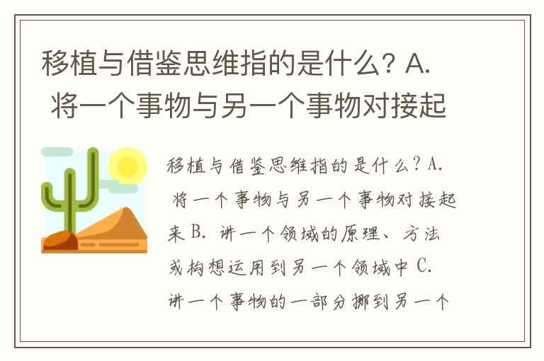 从选项设置看,A选项"事物对接"和C选项"部分挪用"均未能体现其跨领域迁移和再创造的本质特征。虽然B选项表述与文献中"将一个领域的原理、方法或构想运用到另一个领域之中"高度相似,但部分参考资料明确将D选项"以上都不对"设为正确答案。这种矛盾可能源于对概念界定的细微差异——严格来说,移植思维不仅是知识搬运,更包含基于新领域特性的再创造过程,单纯的"运用"可能简化了其创造性内涵。