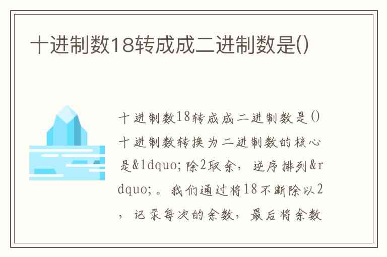 18 ÷ 2 = 9 余数 0 9 ÷ 2 = 4 余数 1 4 ÷ 2 = 2 余数 0 2 ÷ 2 = 1 余数 0 1 ÷ 2 = 0 余数 1↑ 从下往上读取余数 → 10010