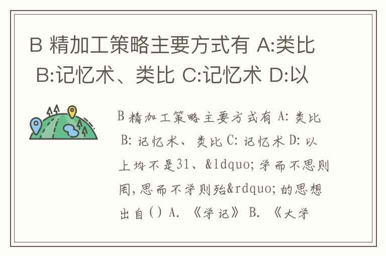 精加工策略是通过对学习材料进行深入加工,促进理解和记忆的有效学习方法,其主要方式包括记忆术和类比。记忆术通过将新信息与熟悉事物建立联系来强化记忆(如谐音法、图像法),类比则通过找出新旧知识的相似性实现迁移应用,二者结合能显著提升学习效果。因此第一题答案为B。