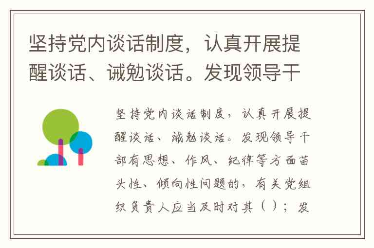 坚持党内谈话制度,认真开展提醒谈话、诫勉谈话。发现领导干部有思想、作风、纪律等方面苗头性、倾向性问题的,有关党组织负责人应当及时对其();发现轻微违纪问题的,上级党组织负责人应当对其(),并由本人作出说明或者检讨,经所在党组织主要负责人签字后报上级纪委和组织部门。 A. 提醒谈话;批评教育 B. 诫勉谈话;批评教育 C. 提醒谈话;诫勉谈话 D. 批评教育;诫勉谈话