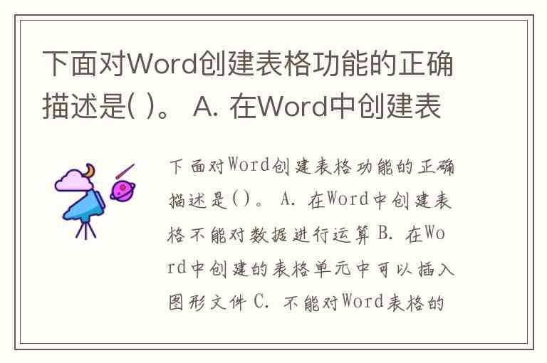 下面对Word创建表格功能的正确描述是( )。 A. 在Word中创建表格不能对数据进行运算 B. 在Word中创建的表格单元中可以插入图形文件 C. 不能对Word表格的行列宽度进行调整 D. 单元格中的数据只能由键盘输入