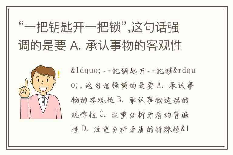 “一把钥匙开一把锁”,这句话强调的是要 A. 承认事物的客观性 B. 承认事物运动的规律性 C. 注重分析矛盾的普遍性 D. 注重分析矛盾的特殊性