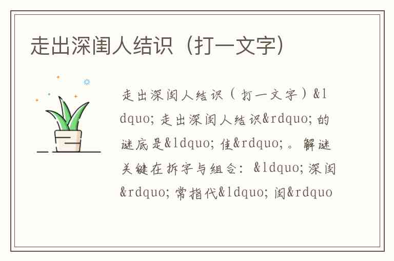 解谜关键在拆字与组合:“深闺”常指代“闺”字,其内部为“圭”;“走出深闺”即取“闺”中之“圭”。“人结识”中的“人”对应汉字部首“亻”(单人旁),“圭”与“亻”组合,便形成“佳”字。整个过程暗合“从闺房中走出(取圭),与人相遇(加亻)”的意境,字形与谜面逻辑严丝合缝。