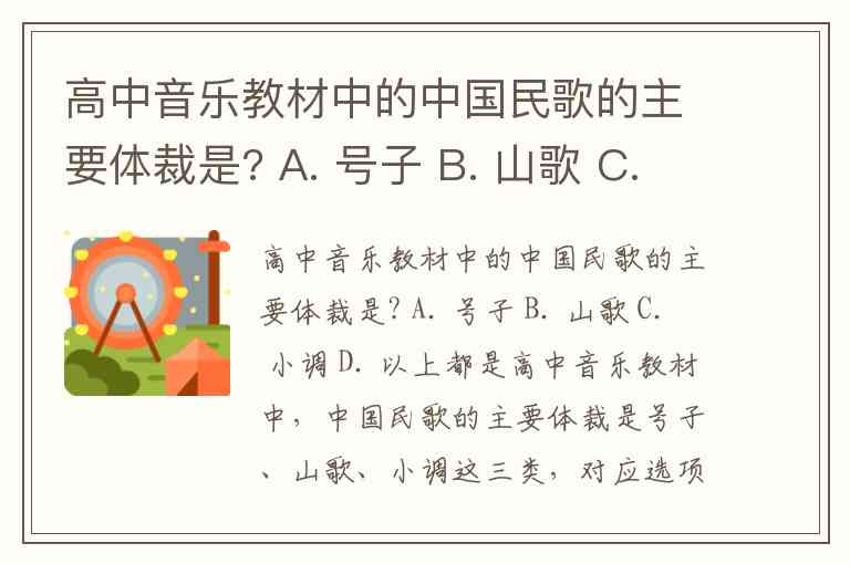 高中音乐教材中,中国民歌的主要体裁是号子、山歌、小调这三类,对应选项D“以上都是”。这一分类源自传统的“三分法”,是学术界和教材中最常用的分类体系,能清晰反映民歌与劳动、生活的紧密联系。