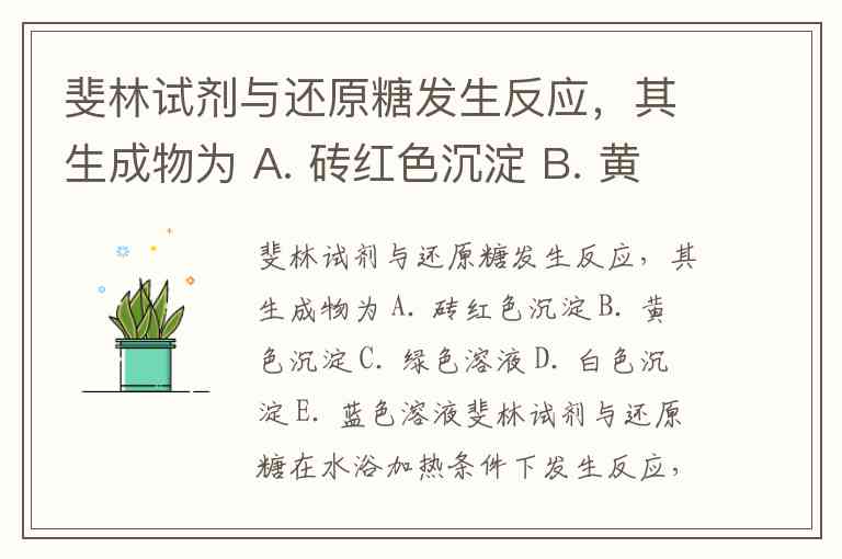 斐林试剂与还原糖发生反应,其生成物为 A. 砖红色沉淀 B. 黄色沉淀 C. 绿色溶液 D. 白色沉淀 E. 蓝色溶液