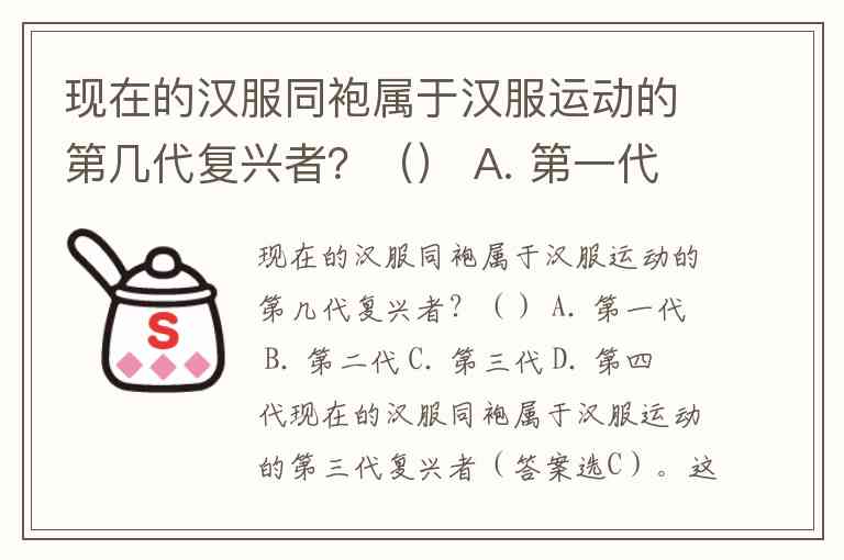 现在的汉服同袍属于汉服运动的第三代复兴者(答案选C)。这一划分在近年汉服知识竞赛题库中被多次明确提及,反映了汉服运动代际传承的共识。