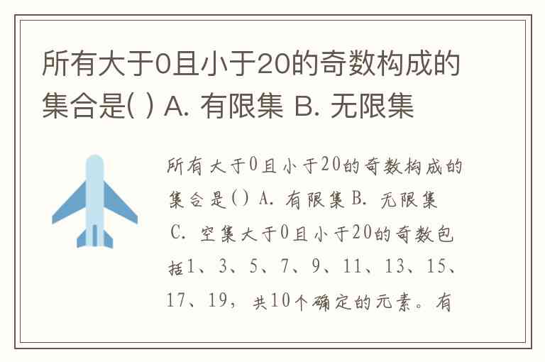 大于0且小于20的奇数包括1、3、5、7、9、11、13、15、17、19,共10个确定的元素。有限集指元素个数为有限个的集合,该集合元素数量明确且可数;无限集元素数量无穷,空集则不含任何元素。因此,此集合符合有限集的定义。