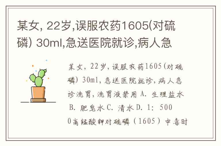 某女, 22岁,误服农药1605(对硫磷) 30ml,急送医院就诊,病人急诊洗胃,洗胃液禁用 A. 生理盐水 B. 肥皂水 C. 清水 D. 1:5000高锰酸钾