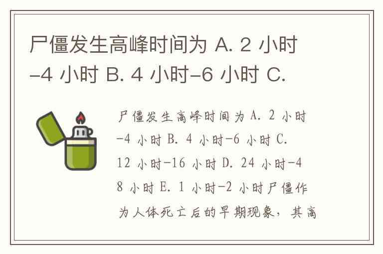 尸僵发生高峰时间为 A. 2 小时-4 小时 B. 4 小时-6 小时 C. 12 小时-16 小时 D. 24 小时-48 小时 E. 1 小时-2 小时