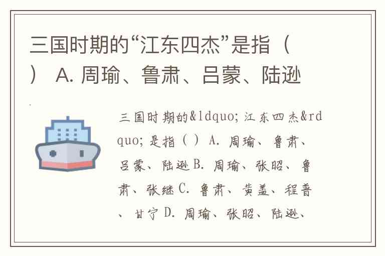 三国时期的“江东四杰”是指() A. 周瑜、鲁肃、吕蒙、陆逊 B. 周瑜、张昭、鲁肃、张继 C. 鲁肃、黄盖、程普、甘宁 D. 周瑜、张昭、陆逊、吕蒙