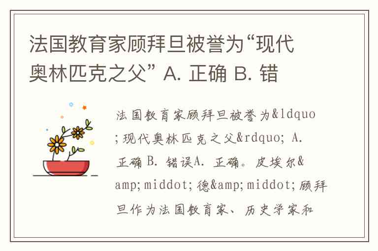 法国教育家顾拜旦被誉为“现代奥林匹克之父” A. 正确 B. 错误