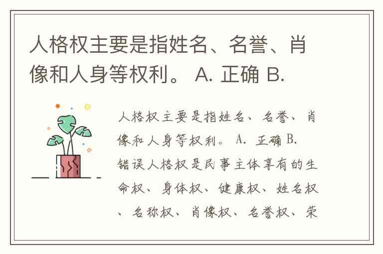 人格权主要是指姓名、名誉、肖像和人身等权利。 A. 正确 B. 错误