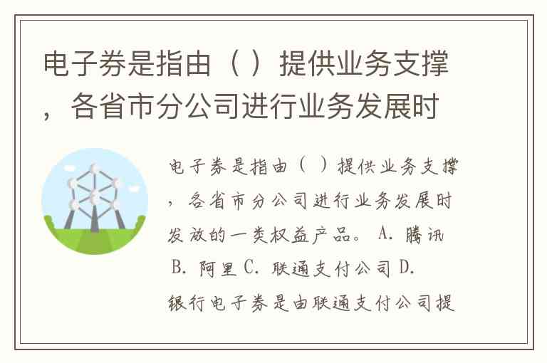 电子券是指由( )提供业务支撑,各省市分公司进行业务发展时发放的一类权益产品。 A. 腾讯 B. 阿里 C. 联通支付公司 D. 银行