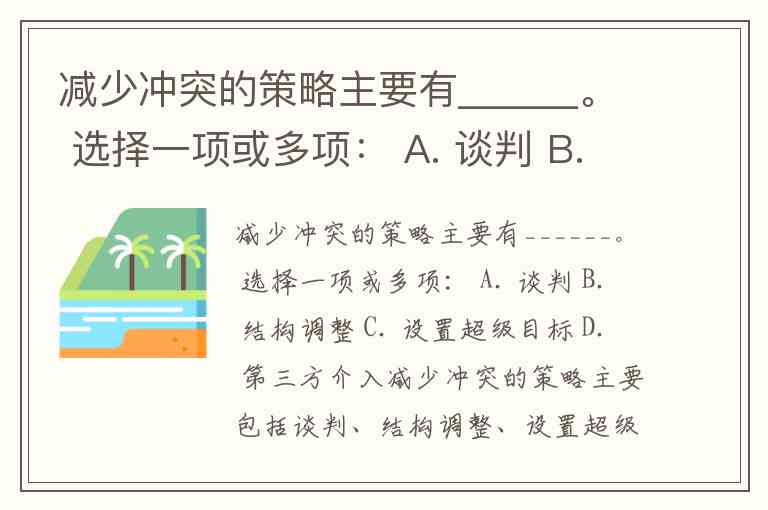 减少冲突的策略主要有______。 选择一项或多项: A. 谈判 B. 结构调整 C. 设置超级目标 D. 第三方介入