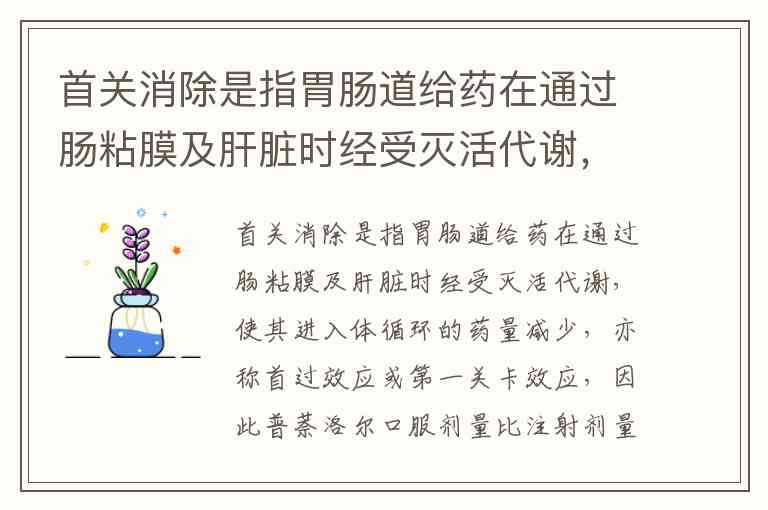 普萘洛尔口服剂量需比注射剂量高约10倍的说法正确,这与首关消除密切相关。首关消除是指药物经胃肠道吸收后,在通过肠黏膜及肝脏时部分被灭活代谢,导致进入体循环的药量减少的过程,又称首关效应或第一关卡效应。普萘洛尔口服后虽胃肠道吸收率达90%,但因肝脏首关消除较强,生物利用度仅为30%,大量药物在进入全身循环前已被代谢失活。而注射给药可直接进入体循环,避开胃肠道和肝脏的首关消除,因此所需剂量显著低于口服剂量。这种剂量差异是临床用药时需考虑的重要因素,体现了给药途径对药物生物利用度的显著影响。