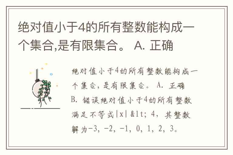 绝对值小于4的所有整数满足不等式|x| < 4,其整数解为-3, -2, -1, 0, 1, 2, 3。这些数具有确定性和互异性,符合集合的定义,构成集合{-3, -2, -1, 0, 1, 2, 3}。该集合包含7个元素,元素个数有限,因此是有限集合。