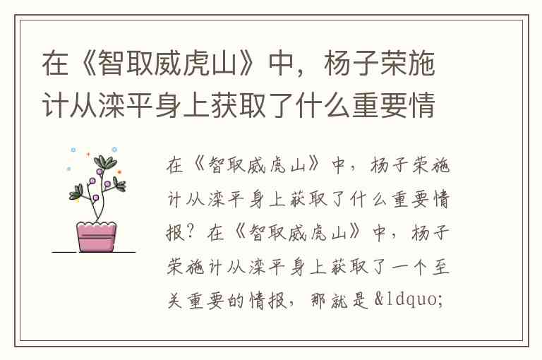 在《智取威虎山》中,杨子荣施计从滦平身上获取了一个至关重要的情报,那就是 “威虎山的老大——金雕山大王的藏匿地点”。具体来说,杨子荣通过与滦平的交谈,借机巧妙地获取了关于金雕山大王藏匿地点的重要信息,为接下来的智取威虎山行动做出了关键的铺垫。