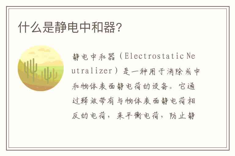 静电中和器(Electrostatic Neutralizer)是一种用于消除或中和物体表面静电荷的设备。它通过释放带有与物体表面静电荷相反的电荷,来平衡电荷,防止静电积累或释放。静电中和器通常应用于电子、化工、医药、印刷等行业,尤其在处理敏感设备或易燃易爆环境时,能有效防止因静电引起的故障、火花或爆炸。