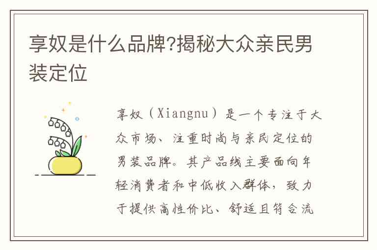 享奴(Xiangnu)是一个专注于大众市场、注重时尚与亲民定位的男装品牌。其产品线主要面向年轻消费者和中低收入群体,致力于提供高性价比、舒适且符合流行趋势的衣物。享奴的品牌定位是注重“时尚、舒适、实用”的男装品牌,旨在通过合理的价格和优质的款式,满足大众群体对日常穿着的需求。