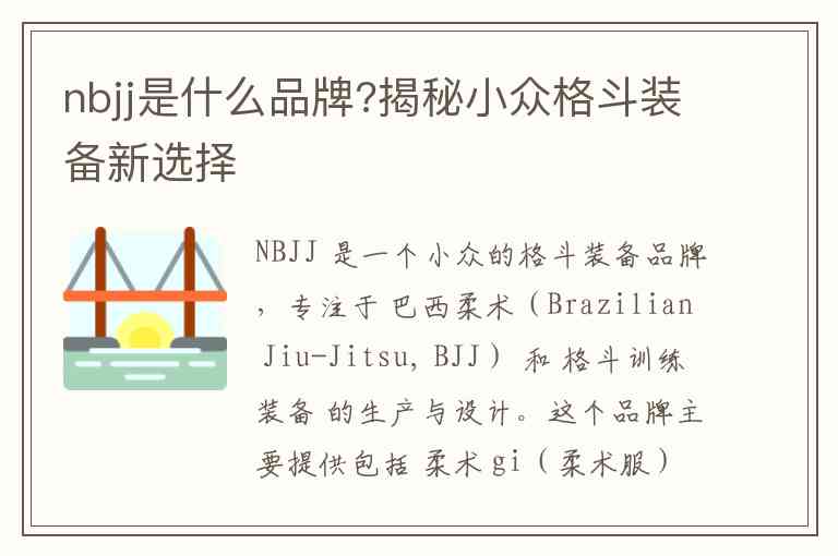 NBJJ 是一个小众的格斗装备品牌,专注于 巴西柔术(Brazilian Jiu-Jitsu, BJJ) 和 格斗训练装备 的生产与设计。这个品牌主要提供包括 柔术 gi(柔术服)、短裤、训练服、护具等 在内的格斗装备,其设计通常注重功能性和舒适性,旨在为格斗爱好者提供高性能的装备。