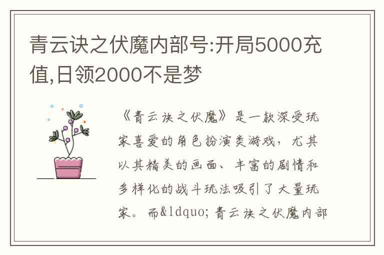 “青云诀之伏魔内部号”的宣传语“开局5000充值,日领2000不是梦”代表的是通过高额充值、特权账号或者活动礼包,玩家能够获得较高的起始资源和日常福利。它是为了吸引玩家通过充值获得更快速的游戏进程和更多的游戏资源,但建议玩家在参与类似活动时保持理性,避免过度消费。