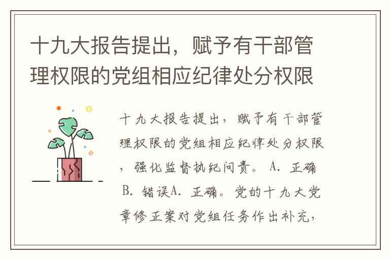 十九大报告提出,赋予有干部管理权限的党组相应纪律处分权限,强化监督执纪问责。 A. 正确 B. 错误