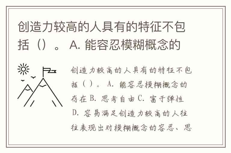创造力较高的人具有的特征不包括()。 A. 能容忍模糊概念的存在 B. 思考自由 C. 富于弹性 D. 容易满足