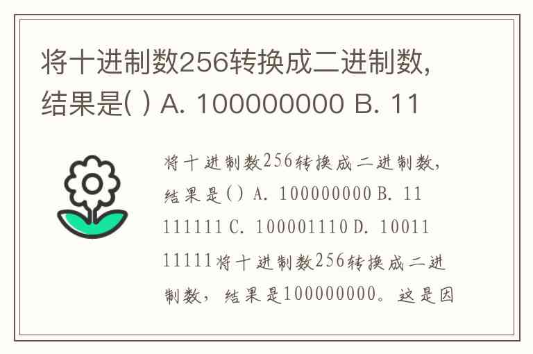 将十进制数256转换成二进制数,结果是100000000。这是因为2⁸=256,在二进制中表示为1后面跟8个0。