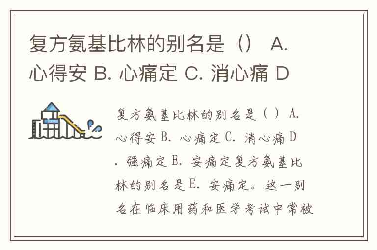 复方氨基比林的别名是 E. 安痛定。这一别名在临床用药和医学考试中常被提及,例如2025年执业药师考试模拟试题就明确将其列为正确答案。药物别名通常反映其核心功效,如安痛定中的“安”和“痛”直接指向其解热镇痛作用,该药物主要用于缓解发热、头痛、神经痛等症状。