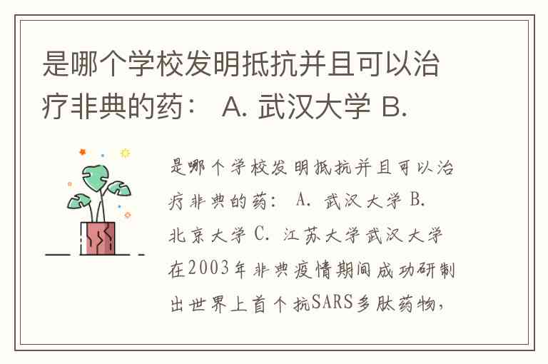 是哪个学校发明抵抗并且可以治疗非典的药: A. 武汉大学 B. 北京大学 C. 江苏大学