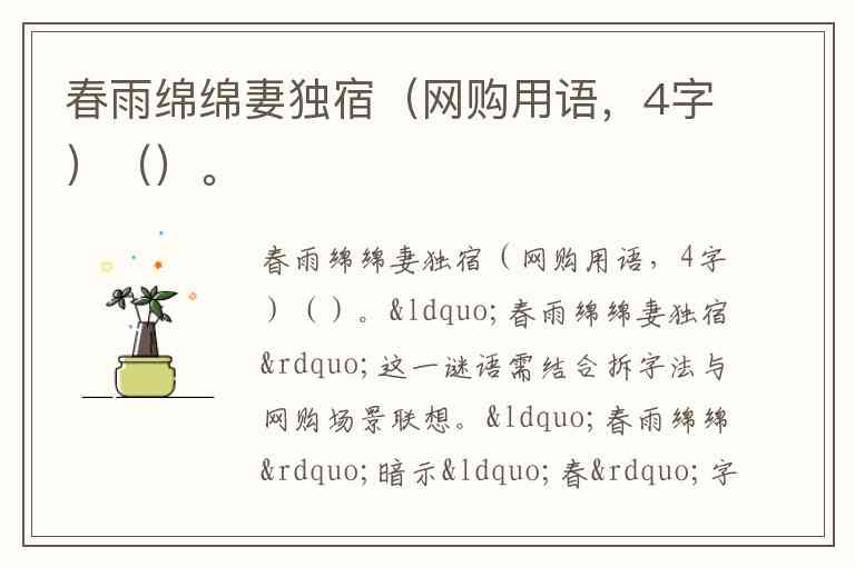 “春雨绵绵妻独宿”这一谜语需结合拆字法与网购场景联想。“春雨绵绵”暗示“春”字因下雨无太阳(日),故去“日”存“夫”;“妻独宿”表明丈夫不在,即“夫”缺席,最终拆得核心意象“单”(独自)。结合网购语境,“单”常指单个商品,四字用语中“单件包邮”(购买一件商品也提供包邮服务)最贴合:“单件”呼应“妻独宿”的独自状态,“包邮”为典型网购服务术语。