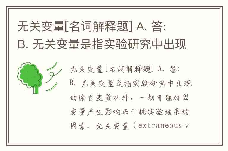 无关变量[名词解释题] A. 答: B. 无关变量是指实验研究中出现的除自变量以外,一切可能对因变量产生影响而干扰实验结果的因素。