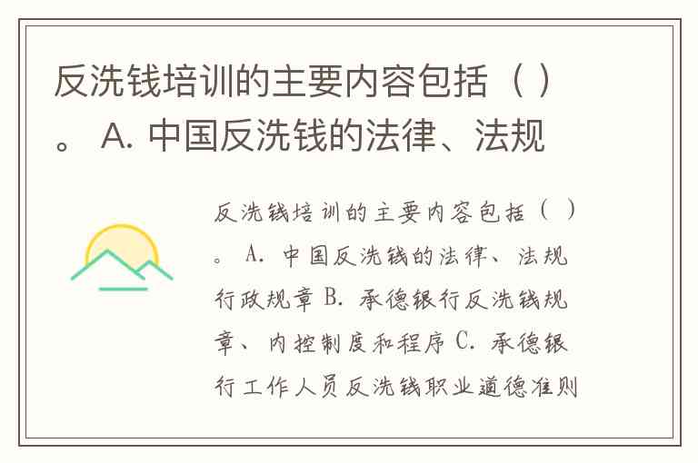 反洗钱培训的主要内容包括( )。 A. 中国反洗钱的法律、法规行政规章 B. 承德银行反洗钱规章、内控制度和程序 C. 承德银行工作人员反洗钱职业道德准则 D. 国际国内洗钱活动特点、规律、发展趋势、案例、经验 E. 国际社会反洗钱的最新进展情况