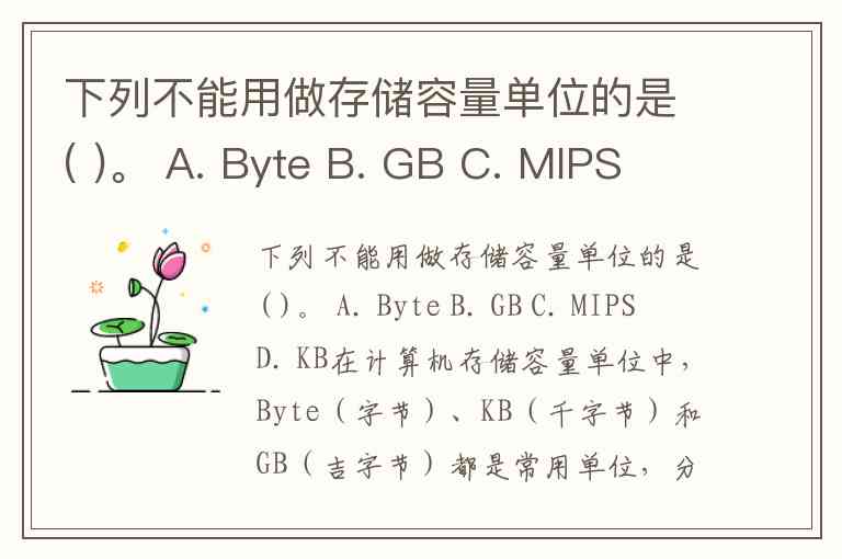 下列不能用做存储容量单位的是( )。 A. Byte B. GB C. MIPS D. KB